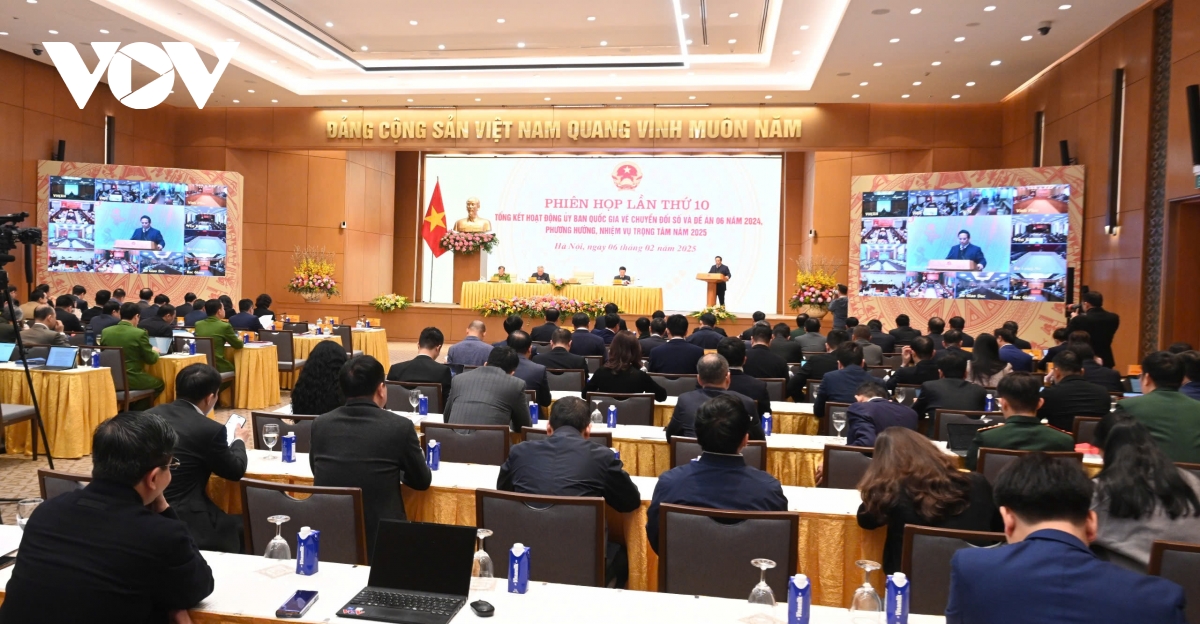 VOV.VN - Chiều nay (6/2), tại trụ sở Chính phủ, Thủ tướng Phạm Minh Chính chủ trì phiên họp lần thứ 10 về tổng kết hoạt động của Ủy ban Quốc gia về chuyển đổi số và Đề án 06 năm 2024, phương hướng, nhiệm vụ trọng tâm năm 2025. Cùng dự có Phó Thủ tướng Thường trực Chính phủ Nguyễn Hòa Bình, lãnh đạo các bộ ngành trung ương và địa phương.
