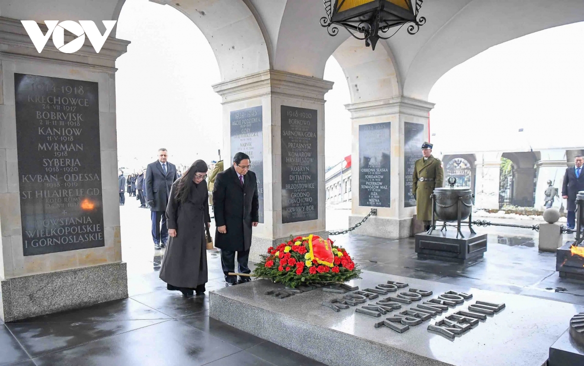 * Sáng cùng ngày, trước khi diễn ra Lễ đón, Thủ tướng Chính phủ Phạm Minh Chính cùng Phu nhân và đoàn đại biểu Việt Nam đã tới đặt vòng hoa tại Khu tưởng niệm các Liệt sỹ vô danh ở Quảng trường Chiến thắng mang tên Nguyên soái Jozef Piłsludski. Đây là Khu tưởng niệm và tượng đài quan trọng nhất ở Ba Lan, nơi tưởng nhớ những người lính vô danh đã cống hiến cuộc đời cho nền độc lập của Ba Lan.