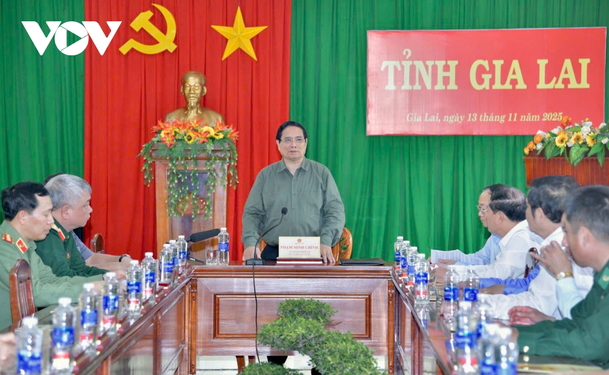 VOV.VN - Trong chuyến công tác tại tỉnh Gia Lai, trưa 13/11, Thủ tướng Phạm Minh Chính đã tới thăm, làm việc với Bộ đội Biên phòng tỉnh Gia Lai, chủ trì cuộc họp với các bộ, ngành, lãnh đạo chủ chốt tỉnh Gia Lai bàn về công tác khắc phục hậu quả cơn bão số 13 trên địa bàn.