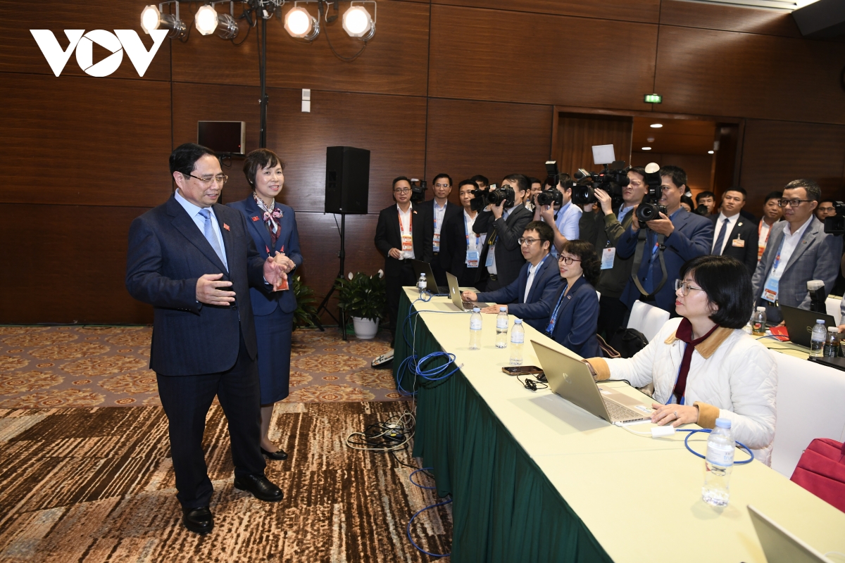 Thủ tướng Phạm Minh Chính ân cần thăm hỏi các phóng viên về điều kiện tác nghiệp, sinh hoạt trong thời gian diễn ra Đại hội XIV của Đảng.