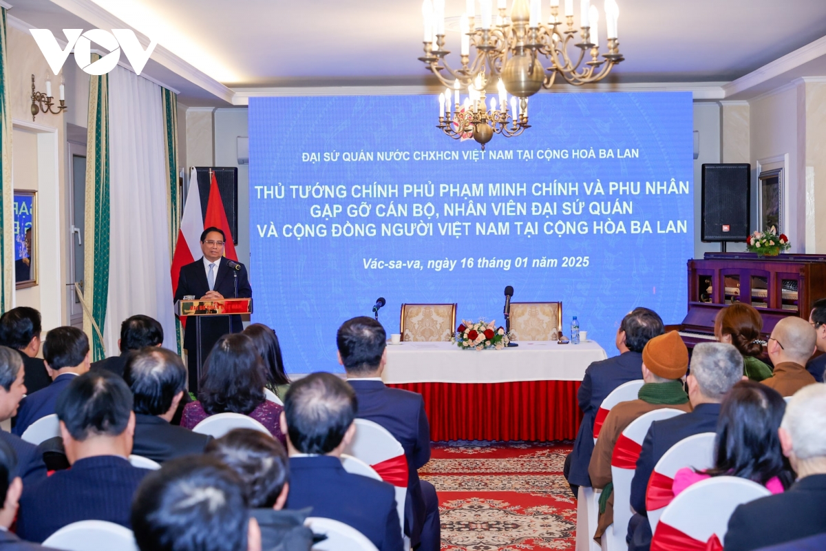 VOV.VN - Tối 16/1, tại Thủ đô Warsaw, trong chương trình thăm chính thức Ba Lan, Thủ tướng Chính phủ Phạm Minh Chính cùng Phu nhân Lê Thị Bích Trân và Đoàn đại biểu Việt Nam đã gặp gỡ cán bộ, nhân viên Đại sứ quán và cộng đồng người Việt Nam tại Ba Lan.
