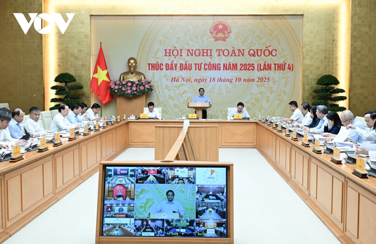 VOV.VN - Sáng nay 18/10, tại Trụ sở Chính phủ, Thủ tướng Phạm Minh Chính chủ trì Hội nghị toàn quốc về thúc đẩy đầu tư công năm 2025 (lần thứ tư). Hội nghị được trực tuyến 34 tỉnh, thành phố trực thuộc Trung ương.