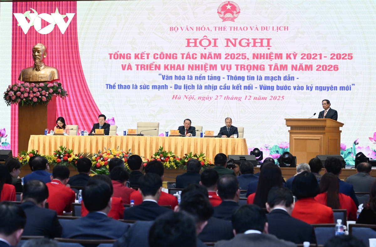 Chiều 27/12 tại Trụ sở Chính phủ, dự Hội nghị Tổng kết công tác năm 2025, nhiệm kỳ 2021-2025 và triển khai nhiệm vụ trọng tâm năm 2026 của Bộ Văn hóa Thể thao và Du lịch, Thủ tướng Chính phủ Phạm Minh Chính đề nghị: tập trung phát triển nền văn hóa Việt Nam tiên tiến, đậm đà bản sắc dân tộc, xây dựng con người Việt Nam phát triển toàn diện, để văn hóa thấm sâu vào đời sống xã hội, thực sự trở thành nền tảng tinh thần vững chắc và nguồn lực nội sinh cho phát triển.