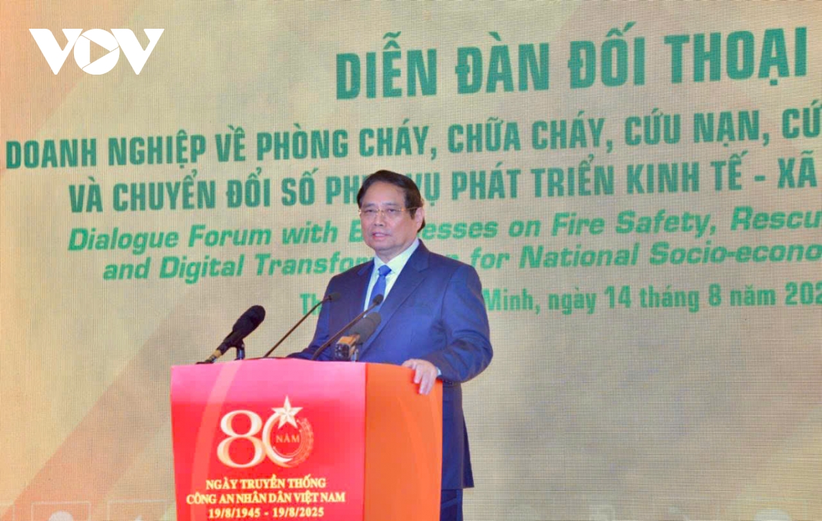 VOV.VN - Sáng 14/8, tại TP.HCM, Thủ tướng Phạm Minh Chính tới dự và phát biểu chỉ đạo tại Diễn đàn Đối thoại với doanh nghiệp về phòng cháy, chữa cháy, công nghiệp hóa, an ninh, an toàn và chuyển đổi số phục vụ phát triển kinh tế - xã hội của đất nước.