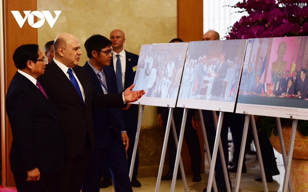 Thủ tướng Phạm Minh Chính và Thủ tướng Nga Mikhail Vladimirovich Mishustin tham quan triển lãm ảnh về tình hữu nghị giữa hai nước