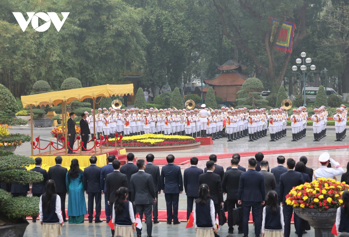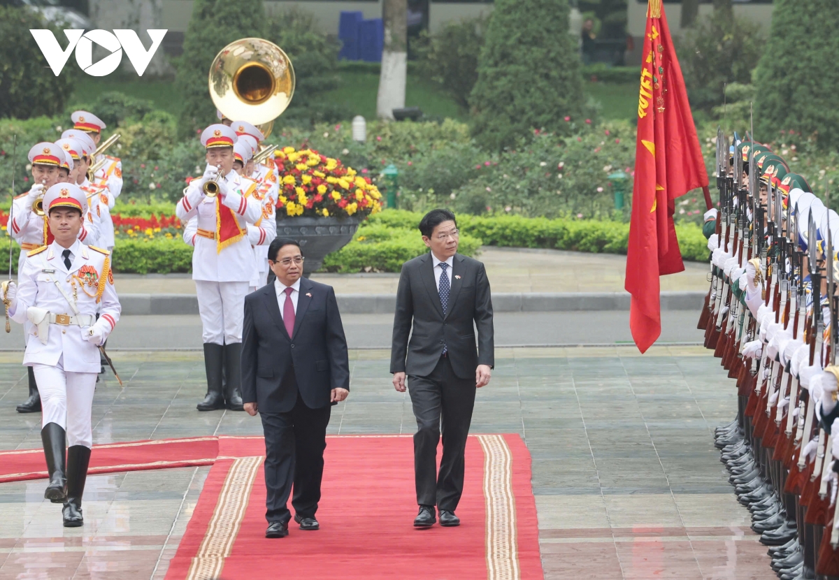Ô tô đưa Thủ tướng Lawrence Wong đến Phủ Chủ tịch, Thủ tướng Phạm Minh Chính và phu nhân đón, bắt tay và tặng hoa Thủ tướng Singapore và phu nhân. Chào mừng Thủ tướng Lawrence Wong và Phu nhân thăm chính thức Việt Nam, Thủ tướng Phạm Minh Chính mời Thủ tướng Singapore bước lên bục danh dự. Quân nhạc cử quốc thiều hai nước.