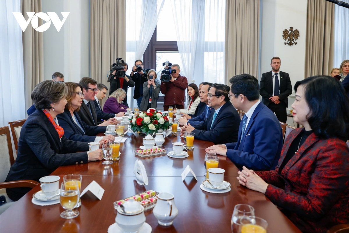 Thủ tướng Phạm Minh Chính cảm ơn sự đón tiếp trọng thị, chân tình mà Chủ tịch Thượng viện Malgorzata Kidawa-Blonska và các lãnh đạo cấp cao của Ba Lan đã dành cho đoàn đại biểu Chính phủ Việt Nam. Thủ tướng khẳng định, trong triển khai đường lối đối ngoại độc lập, tự chủ, đa phương hóa, đa dạng hóa quan hệ quốc tế, Việt Nam luôn coi trọng và mong muốn tăng cường hợp tác với các nước bạn truyền thống Trung Đông Âu, trong đó Ba Lan là một đối tác ưu tiên hàng đầu.