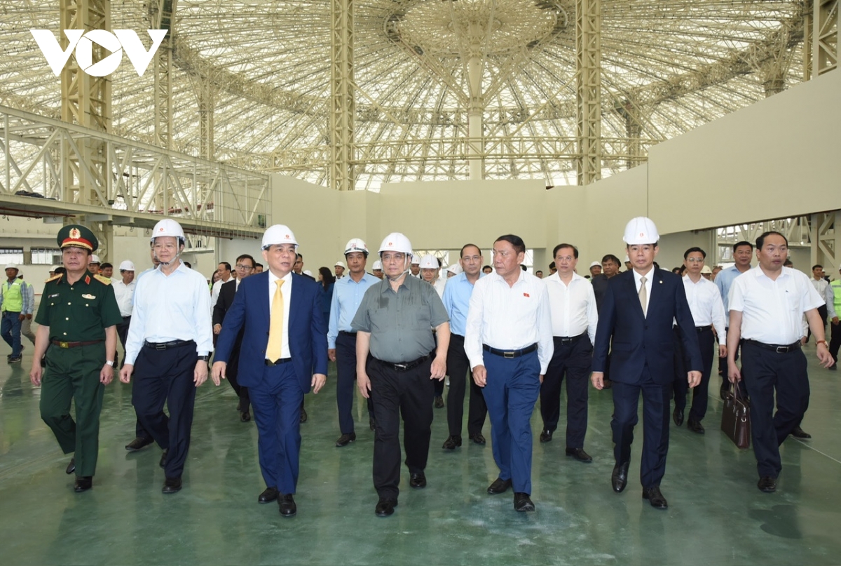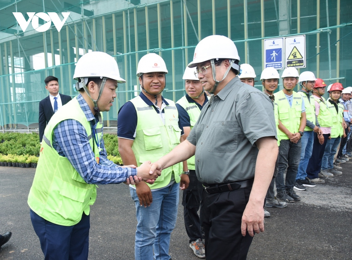Kiểm tra tiến độ dự án, Thủ tướng vui mừng trước không khí lao động khẩn trương, sôi nổi. Người đứng đầu Chính phủ yêu cầu khẩn trương đẩy nhanh tiến độ xây dựng Trung tâm để phục vụ "Triển lãm thành tựu của đất nước dịp kỷ niệm 80 năm Cách mạng tháng Tám (19/8/1945 - 19/8/2025) và Quốc khánh (2/9/1945 - 2/9/2025):