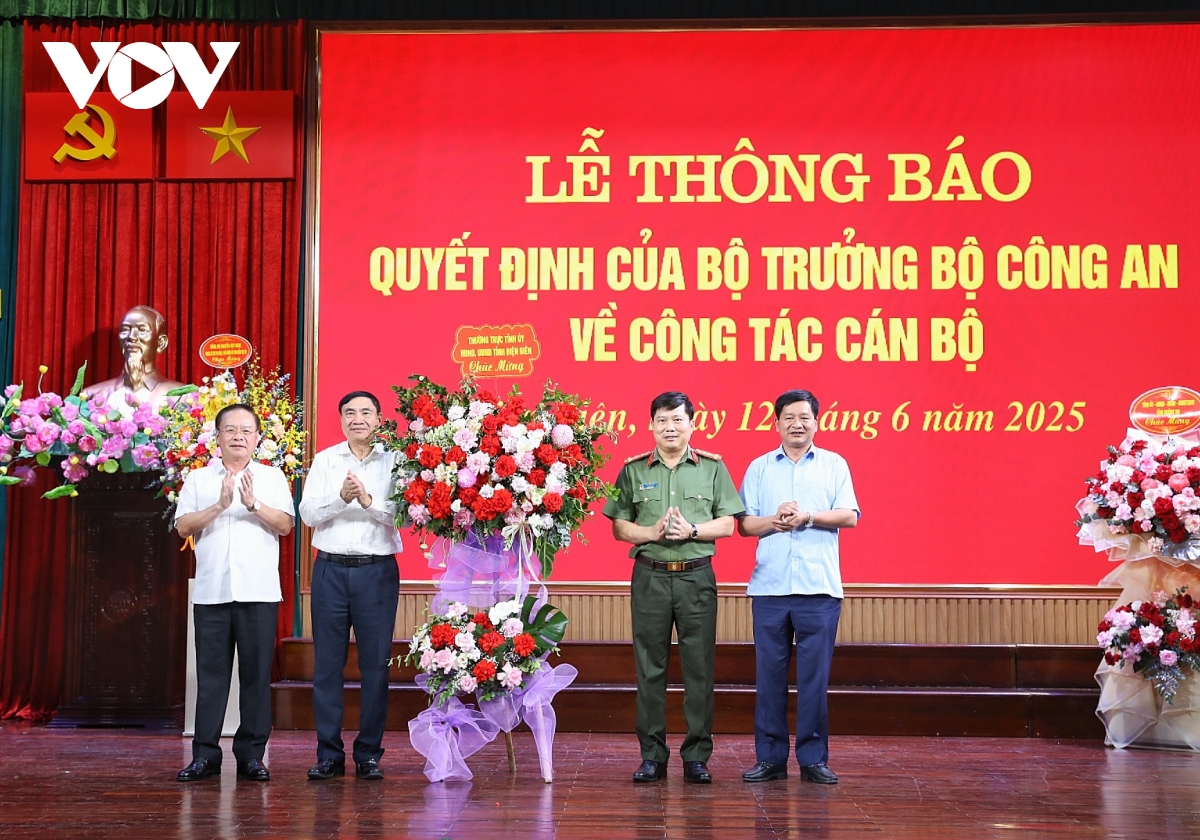 VOV.VN - Chiều 12/6, Công an tỉnh Điện Biên đã tổ chức Lễ công bố Quyết định của Bộ trưởng Bộ Công an về công tác cán bộ đối với chức danh Giám đốc Công an tỉnh Điện Biên.