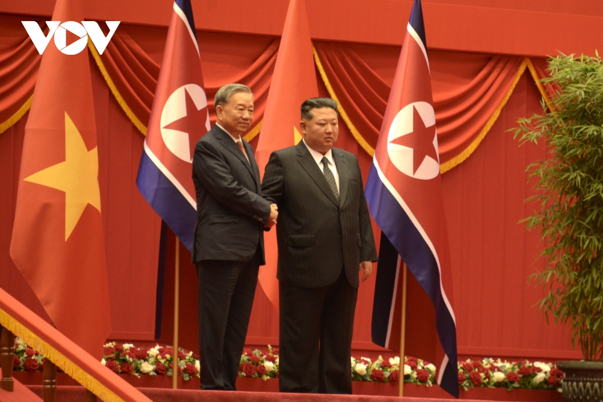 Sáng 9/10, tại Cung Thể thao ở Thủ đô Bình Nhưỡng, Tổng Bí thư, Chủ tịch Quốc vụ CHDCND Triều Tiên Kim Jong Un đã chủ trì lễ đón trọng thể Tổng Bí thư Tô Lâm và đoàn đại biểu cấp cao Việt Nam sang thăm cấp Nhà nước tới Triều Tiên và dự Lễ kỷ niệm 80 năm thành lập Đảng Lao động Triều Tiên. Quân nhạc cử Quốc thiều 2 nước Việt Nam – Triều Tiên trên nền nhạc 21 loạt đại bác chào mừng.