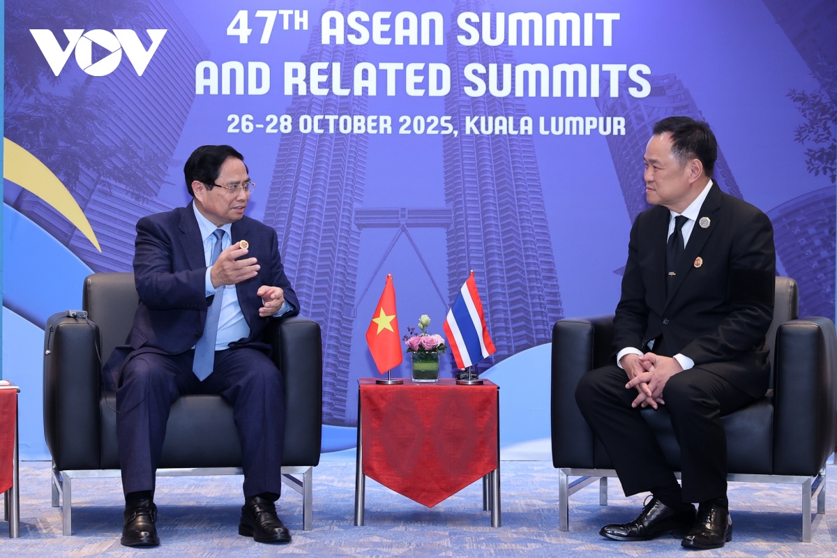 Ngày 27/10, trong khuôn khổ Hội nghị Cấp cao ASEAN lần thứ 47 và các Hội nghị Cấp cao liên quan, Thủ tướng Phạm Minh Chính đã có các cuộc gặp Chủ tịch Hội đồng Châu Âu Antonio Costa, Thủ tướng Trung Quốc Lý Cường, Tổng thống Hàn Quốc Lee Jae Myung, Tổng thống Indonesia Prabowo Subianto, Thủ tướng New Zealand Christopher Luxon, Tổng thống Philippines Ferdinand Marcos Jr, Thủ tướng Thái Lan Anutin Charnvirakul, Tổng Giám đốc Quỹ Tiền tệ Quốc tế Kristalina Georgieva, Thủ tướng Australia Anthony Albanese, Phó Thủ tướng Nga Alexey Overchuk. Trong ảnh: Thủ tướng Phạm Minh Chính gặp Thủ tướng Thái Lan Anutin Charnvirakul.