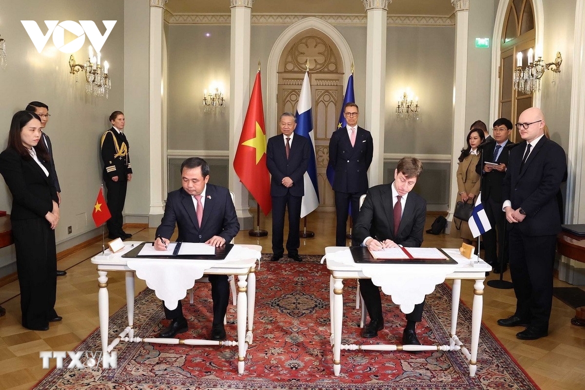Trưa 21/10, Tổng Bí thư Tô Lâm và Tổng thống Phần Lan Alexander Stubb đã chứng kiến Lễ ký kết các văn kiện hợp tác song phương gồm: Bản ghi nhớ về hợp tác song phương trong lĩnh vực môi trường, đa dạng sinh học và biến đổi khí hậu giữa Bộ Nông nghiệp và Môi trường Việt Nam và Bộ Môi trường Phần Lan; Biên bản ghi nhớ giữa Bộ Tài chính Việt Nam và Bộ Ngoại giao Phần Lan về việc hỗ trợ và thúc đẩy công tác chuẩn bị và triển khai các dự án được tài trợ theo Chương trình đầu tư công của Phần Lan; Biên bản ghi nhớ giữa Bộ Tài chính Việt Nam và Cơ quan tín dụng xuất khẩu Phần Lan. (Ảnh: TTXVN)