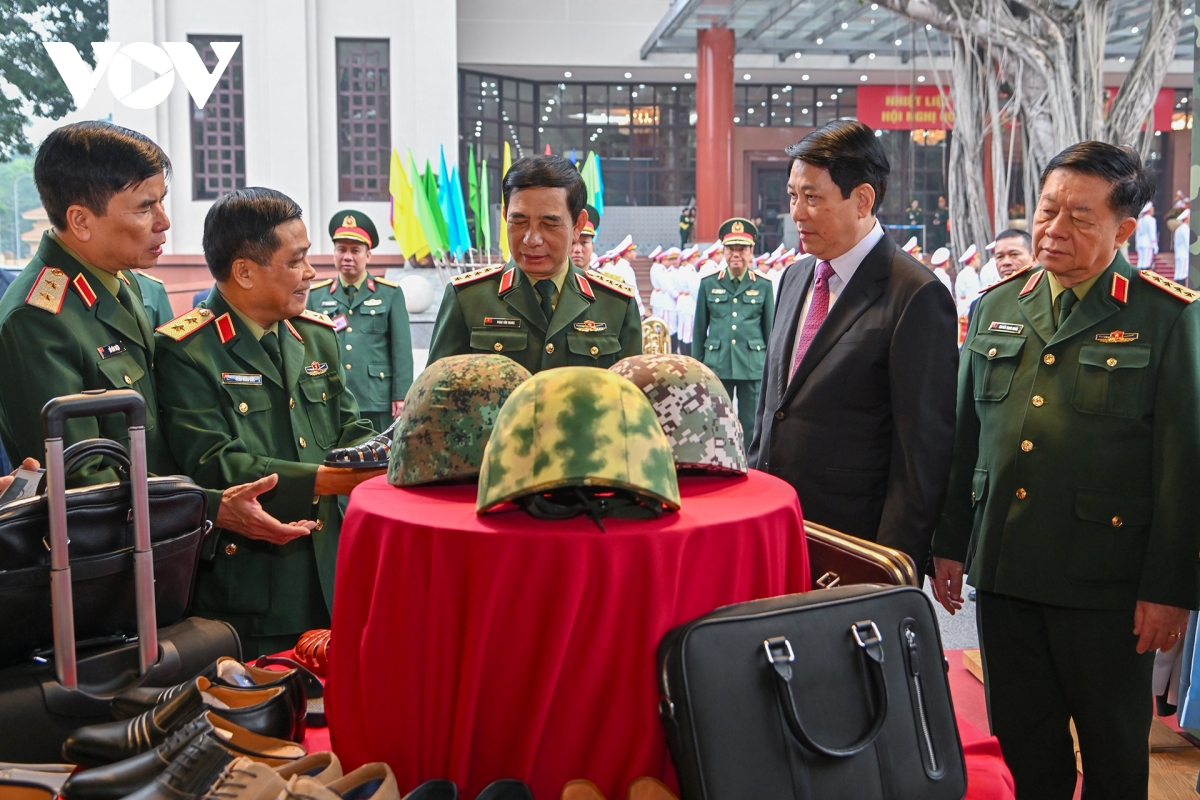 Chủ tịch nước Lương Cường cùng các đại biểu tham quan trưng bày của Bộ Quốc phòng tại hội nghị.
