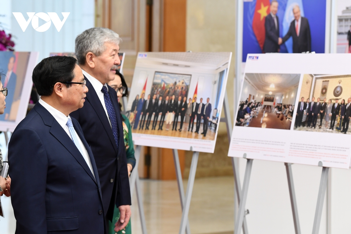 Thủ tướng Phạm Minh Chính và Thủ tướng Kyrgyzstan Adylbek Kasymaliev tham quan triển lãm ảnh về tình hữu nghị giữa hai nước.