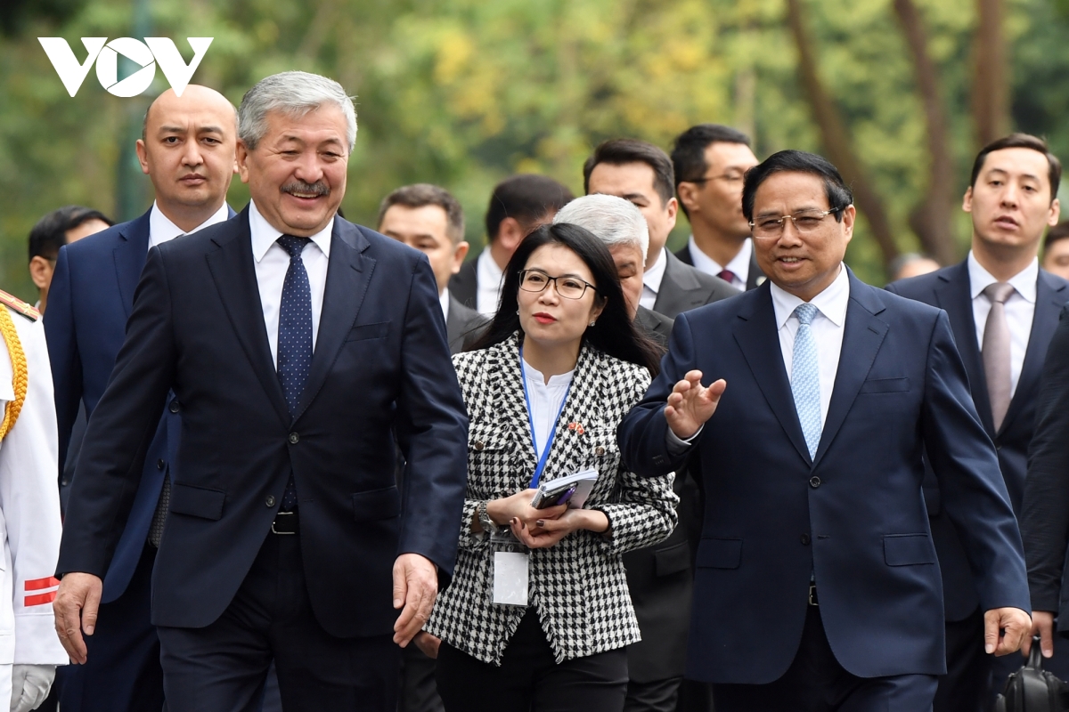 Sau lễ đón, Thủ tướng Phạm Minh Chính và Thủ tướng Kyrgyzstan Adylbek Kasymaliev cùng đi bộ về Trụ sở Chính phủ để tiến hành hội đàm.