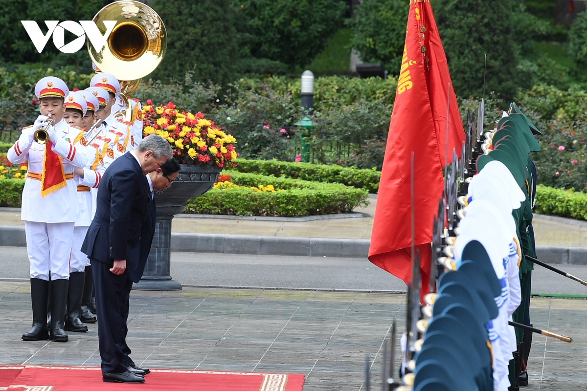 Hai Thủ tướng cúi chào Quân kỳ Quyết thắng của Quân đội nhân dân Việt Nam.