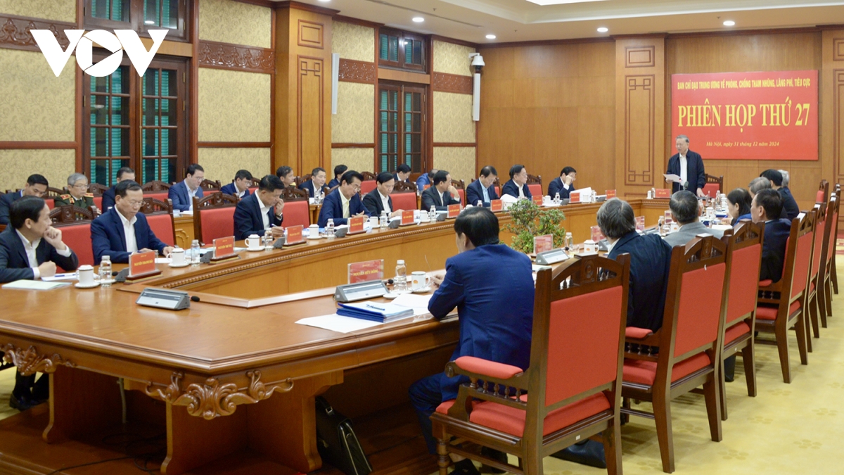 VOV.VN - Sáng 31/12, tại Trụ sở Trung ương Đảng, Ban Chỉ đạo Trung ương về phòng, chống tham nhũng, lãng phí, tiêu cực họp Phiên thứ 27 để thảo luận, cho ý kiến về Kết quả hoạt động năm 2024 và Chương trình công tác năm 2025 cùng một số nội dung quan trọng khác. Tổng Bí thư Tô Lâm chủ trì phiên họp.