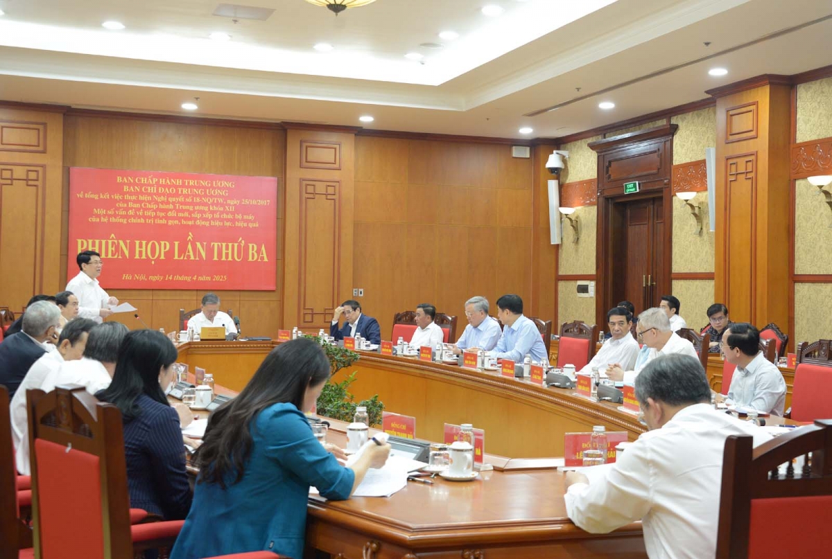 VOV.VN - Sáng 14/4 tại Trụ sở TW Đảng, Tổng Bí thư Tô Lâm chủ trì phiên họp thứ 3 Ban Chỉ đạo Trung ương về tổng kết Nghị quyết 18 ngày 25/10/2017 của Ban Chấp hành Trung ương khoá XII một số vấn đề về tiếp tục đổi mới, sắp xếp tổ chức bộ máy của hệ thống chính trị tinh gọn, hoạt động hiệu lực, hiệu quả.