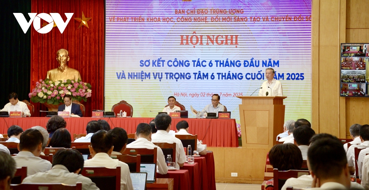 VOV.VN - Sáng 2/7, tại Hà Nội, Tổng Bí thư Tô Lâm, Trưởng Ban Chỉ đạo Trung ương về phát triển khoa học, công nghệ, đổi mới sáng tạo và chuyển đổi số chủ trì Hội nghị sơ kết công tác 6 tháng đầu năm của Ban Chỉ đạo và triển khai nhiệm vụ các tháng cuối năm.