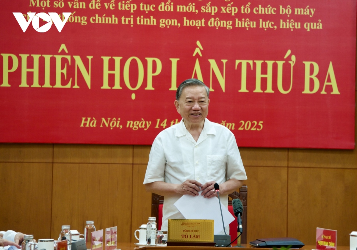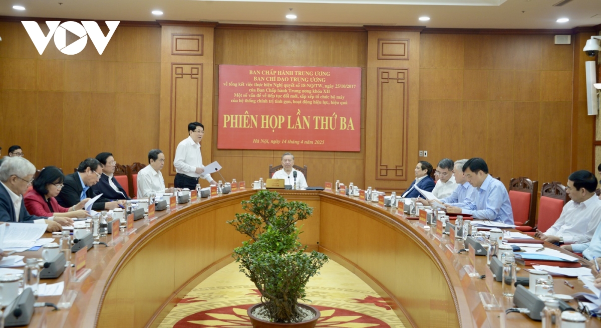 VOV.VN - Sáng 14/4 tại Trụ sở TW Đảng, Tổng Bí thư Tô Lâm chủ trì phiên họp thứ 3 Ban Chỉ đạo Trung ương về tổng kết Nghị quyết 18 ngày 25/10/2017 của Ban Chấp hành Trung ương khoá XII một số vấn đề về tiếp tục đổi mới, sắp xếp tổ chức bộ máy của hệ thống chính trị tinh gọn, hoạt động hiệu lực, hiệu quả.