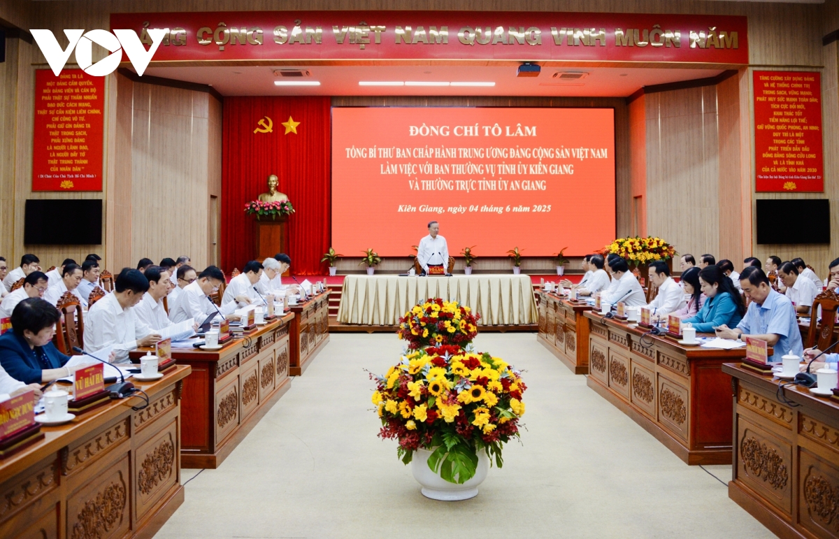 Ngày 4/6, tại Kiên Giang, Tổng Bí thư Tô Lâm chủ trì buổi làm việc với Ban Thường vụ Tỉnh ủy Kiên Giang và Thường trực Tỉnh ủy An Giang về tình hình triển khai thực hiện các nghị quyết, kết luận của Trung ương; việc sắp xếp tổ chức bộ máy, công tác ổn định tình hình mọi mặt, công tác quốc phòng an ninh, việc lãnh đạo thực hiện nhiệm vụ tăng trưởng kinh tế, công tác an sinh xã hội, giảm nghèo và nâng cao đời sống nhân dân tại 2 địa phương.