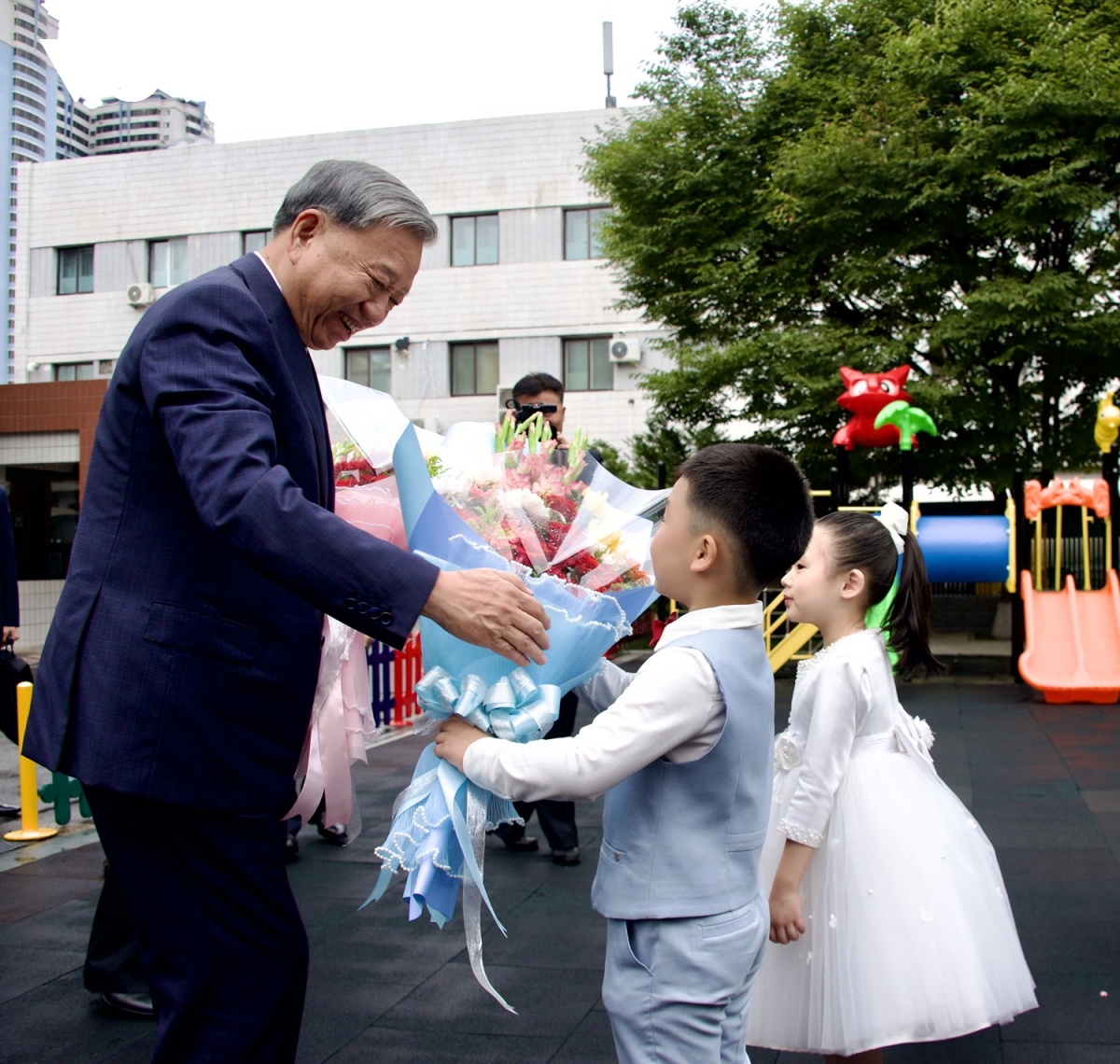 Học sinh Trường mẫu giáo Kiêng Sang tặng hoa Tổng Bí thư Tô Lâm.