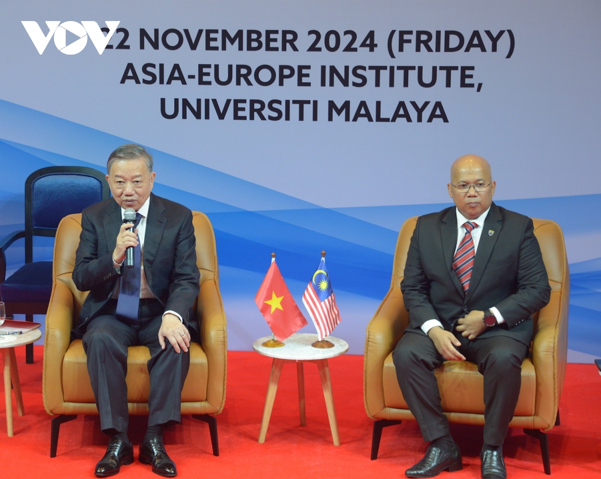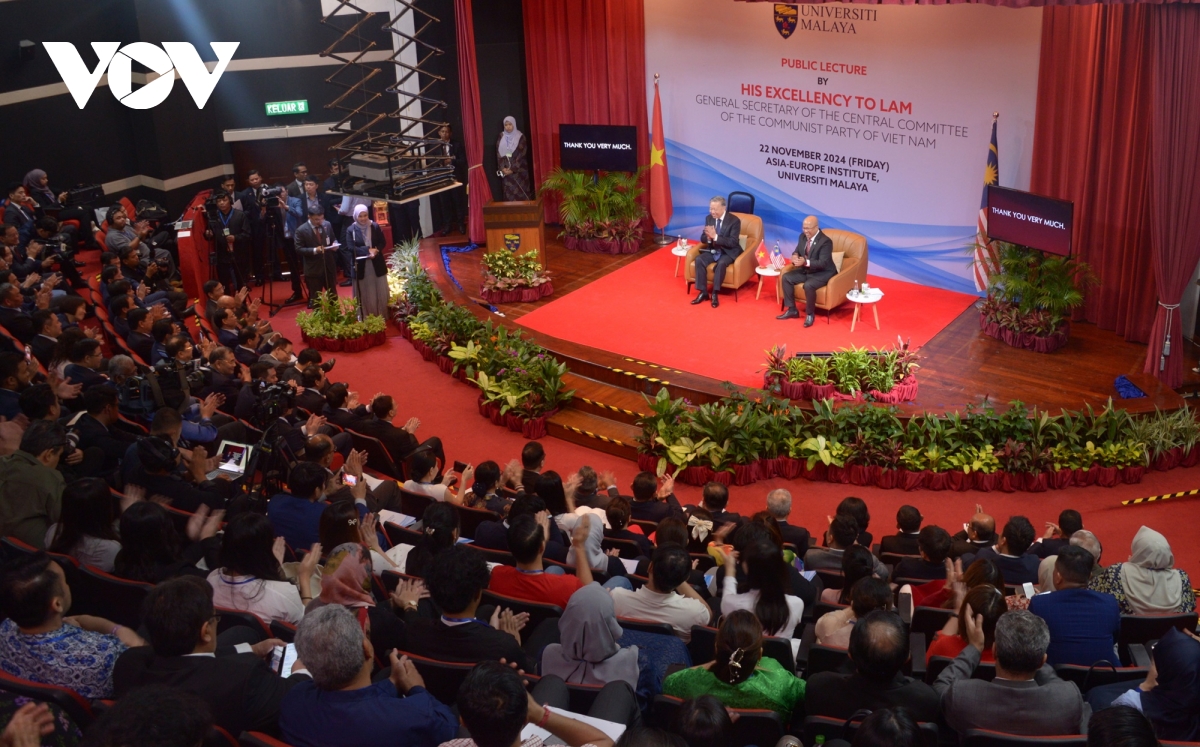 Nói chuyện thân mật với đông đảo các Giáo sư, giảng viên, các bạn sinh viên, Tổng Bí thư Tô Lâm bày tỏ vinh dự được đến thăm và phát biểu tại ngôi trường danh tiếng biểu tượng của nền giáo dục Malaysia, trở thành cái nôi đào tạo của nhiều thế hệ tài năng xuất sắc, trong đó có ngài Thủ tướng Anwar Ibrahim cùng bốn vị thủ tướng khác của Malaysia. Tổng Bí thư Tô Lâm cho rằng, sự phát triển và thành công của Đại học Malaya trước hết là một biểu tượng của những thành tựu to lớn mà nhân dân Malaysia đã đạt được trong gần 7 thập kỷ sau ngày giành độc lập. Cho biết, cũng như Malaysia, Việt Nam đã và đang chuyển mình mạnh mẽ, đến nay sau gần 80 năm kể từ khi lập nước và gần 40 năm Đổi mới, dưới sự lãnh đạo của Đảng Cộng sản, nhân dân Việt Nam đã giành được những thành tựu to lớn, có ý nghĩa lịch sử, hiện Việt Nam có quy mô nền kinh tế tương đương với Malaysia, nằm trong top 40 của thế giới và thuộc nhóm 20 thị trường hàng đầu về thương mại quốc tế. Trong ASEAN, từ năm 2015 Việt Nam đã là nước duy nhất có quan hệ ở cấp Đối tác chiến lược với Malaysia và nay đã được nâng cấp lên một tầm cao mới.