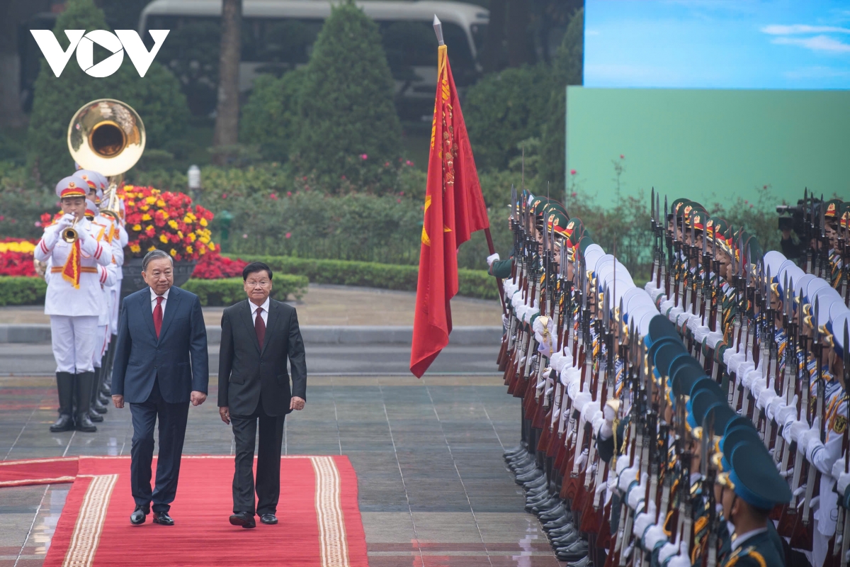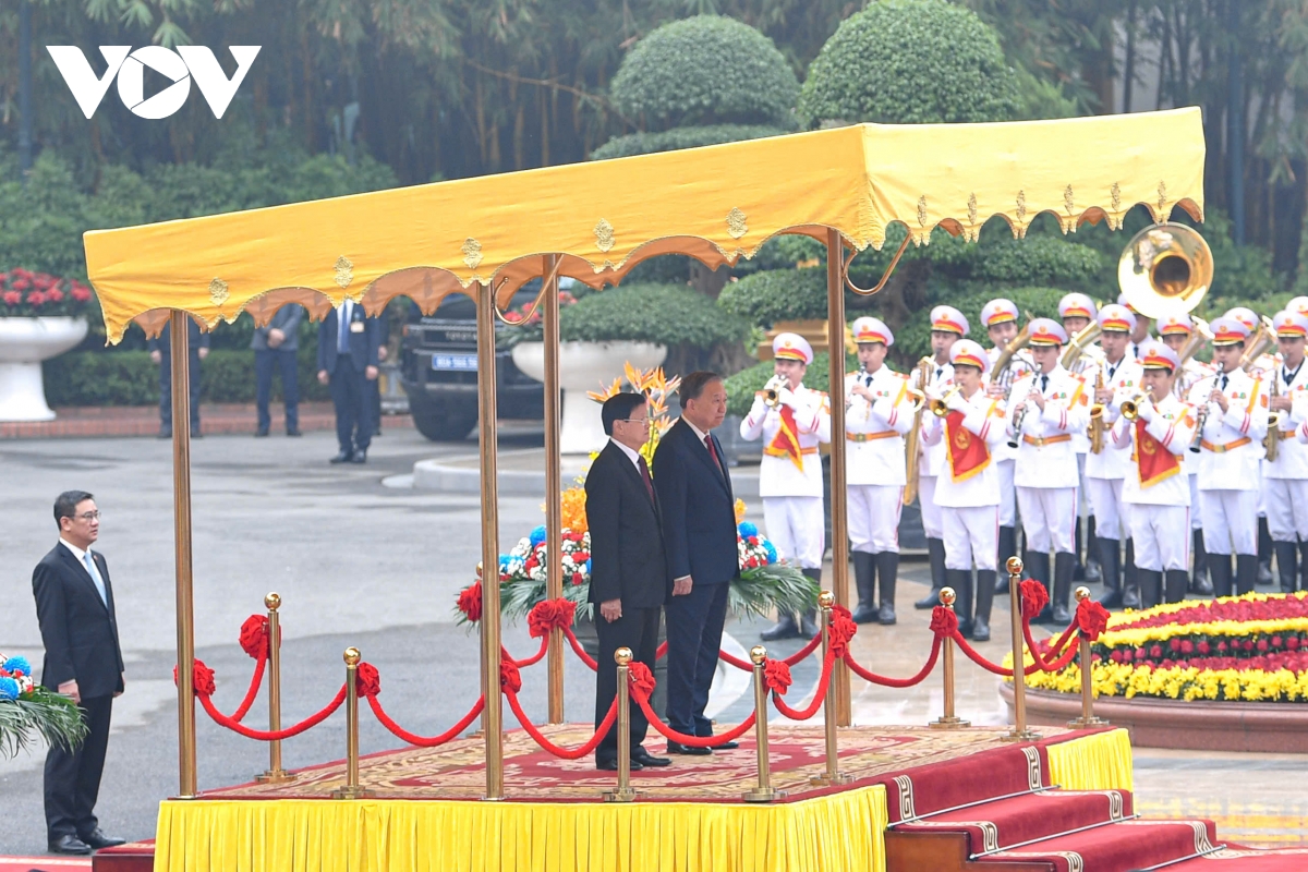 Tổng Bí thư Tô Lâm mời Tổng Bí thư, Chủ tịch nước Lào Thongloun Sisoulith duyệt Đội Danh dự Quân đội nhân dân Việt Nam. Sau duyệt Đội Danh dự, Tổng Bí thư Tô Lâm và Tổng Bí thư, Chủ tịch nước Lào Thongloun Sisoulith cùng tới chào các thành viên Đoàn Cấp cao hai nước dự Lễ đón.