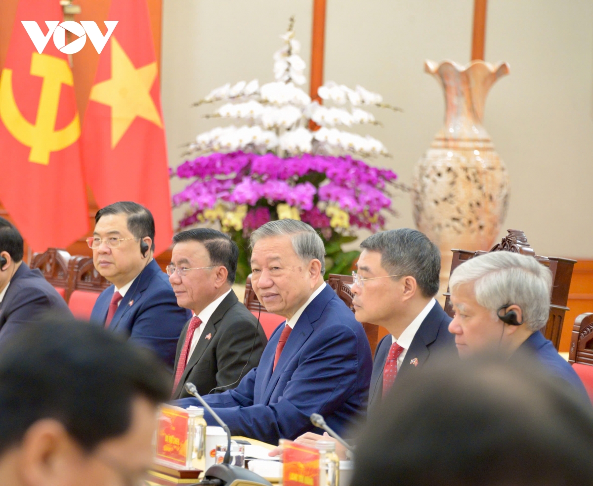 Về phần mình, Tổng Bí thư, Chủ tịch nước Lào Thongloun Sisoulith cũng nhấn mạnh: "Hôm nay tôi rất vinh dự và vui mừng được dẫn đầu đoàn đại biểu cấp cao của Lào sang thăm Cấp Nhà nước tới Việt Nam, chuyến thăm diễn ra trong bầu không khí hai nước vừa hoàn thành Đại hội Đảng toàn quốc ở mỗi nước. Tôi xin chân thành gửi lời cảm ơn đến Tổng Bí thư Tô Lâm đón tiếp chúng tôi trong một bầu không khí ấm áp, điều này thể hiện tình đoàn kết hữu nghị giữa hai Đảng, hai nước và nhân dân hai nước. Một lần nữa thay mặt Đảng, Nhà nước nhân dân Lào tôi xin được gửi lời chúc mừng tới sự thành công của Đại hội đại biểu toàn quốc lần thứ XIV của Đảng Cộng sản Việt Nam và đặc biệt chúc mừng đồng chí Tô Lâm được Đại hội tín nhiệm tiếp tục bầu là Tổng Bí thư Ban chấp hành Trung ương Đảng cộng sản Việt Nam khoá XIV".