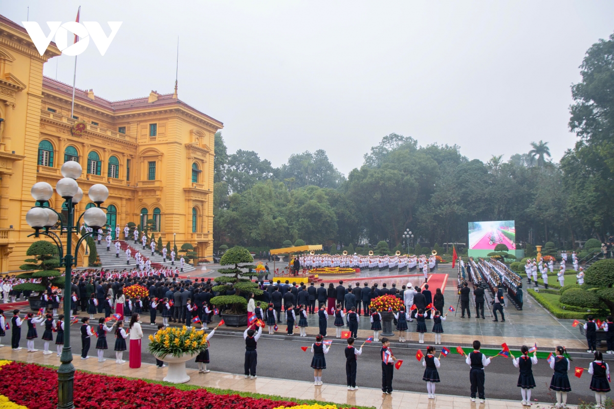 Từ sáng sớm, dọc đại lộ Hùng Vương dẫn vào Phủ Chủ tịch, đông đảo các em thiếu niên, học sinh và người dân Thủ đô với cờ Việt Nam, Lào và những bông hoa tươi thắm trên tay chào đón Tổng Bí thư, Chủ tịch nước Lào Thongloun Sisoulith cùng Phu nhân và Đoàn đại biểu Cấp cao Đảng, Nhà nước Lào.