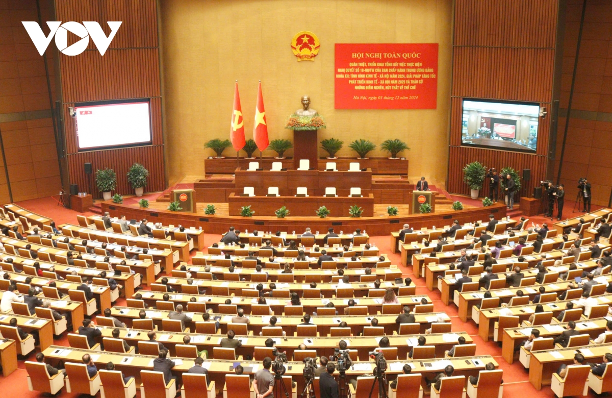 Sáng nay (1/12) tại Nhà Quốc hội, Bộ Chính trị, Ban Bí thư tổ chức hội nghị toàn quốc trực tuyến tới điểm cầu các cơ quan Trung ương; các tỉnh ủy, thành ủy trực thuộc Trung ương và đến các điểm cầu cấp xã với sự tham dự của hơn 1,3 triệu đại biểu nhằm quán triệt triển khai tổng kết việc thực hiện Nghị quyết 18 của Ban Chấp hành Trung ương Đảng khoá 12, tình hình kinh tế xã hội năm 2024, giải pháp tăng tốc phát triển kinh tế xã hội năm 2025 và tháo gỡ những điểm nghẽn, nút thắt về thể chế.