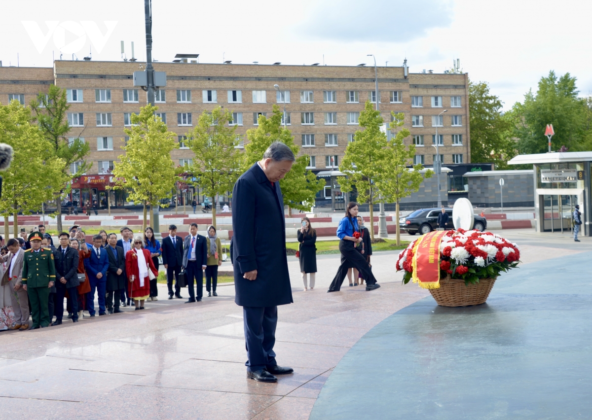 Trong không khí trang nghiêm xúc động, Tổng Bí thư Tô Lâm và Phu nhân cùng Đoàn đại biểu cấp cao Việt Nam đã dâng hoa và dành một phút mặc niệm tưởng nhớ anh linh Chủ tịch Hồ Chí Minh, lãnh tụ kính yêu của nhân dân Việt Nam, nhà lãnh đạo lỗi lạc của Đảng Cộng sản Việt Nam và phong trào cộng sản thế giới, anh hùng giải phóng dân tộc, nhà văn hóa kiệt xuất. Chủ tịch Hồ Chí Minh cũng là người bạn lớn của nhân dân Nga, người đã đặt nền móng cho mối quan hệ hữu nghị truyền thống giữa hai nước Việt Nam - Liên bang Nga.