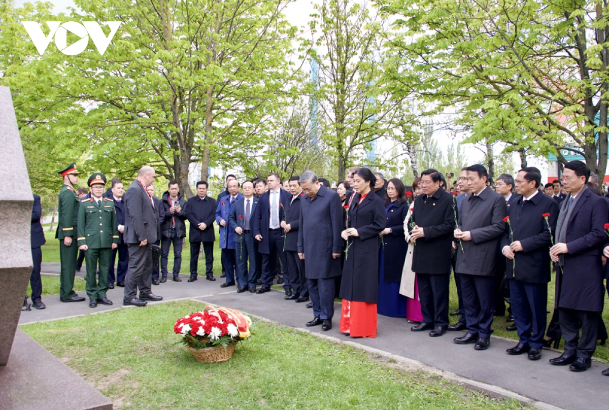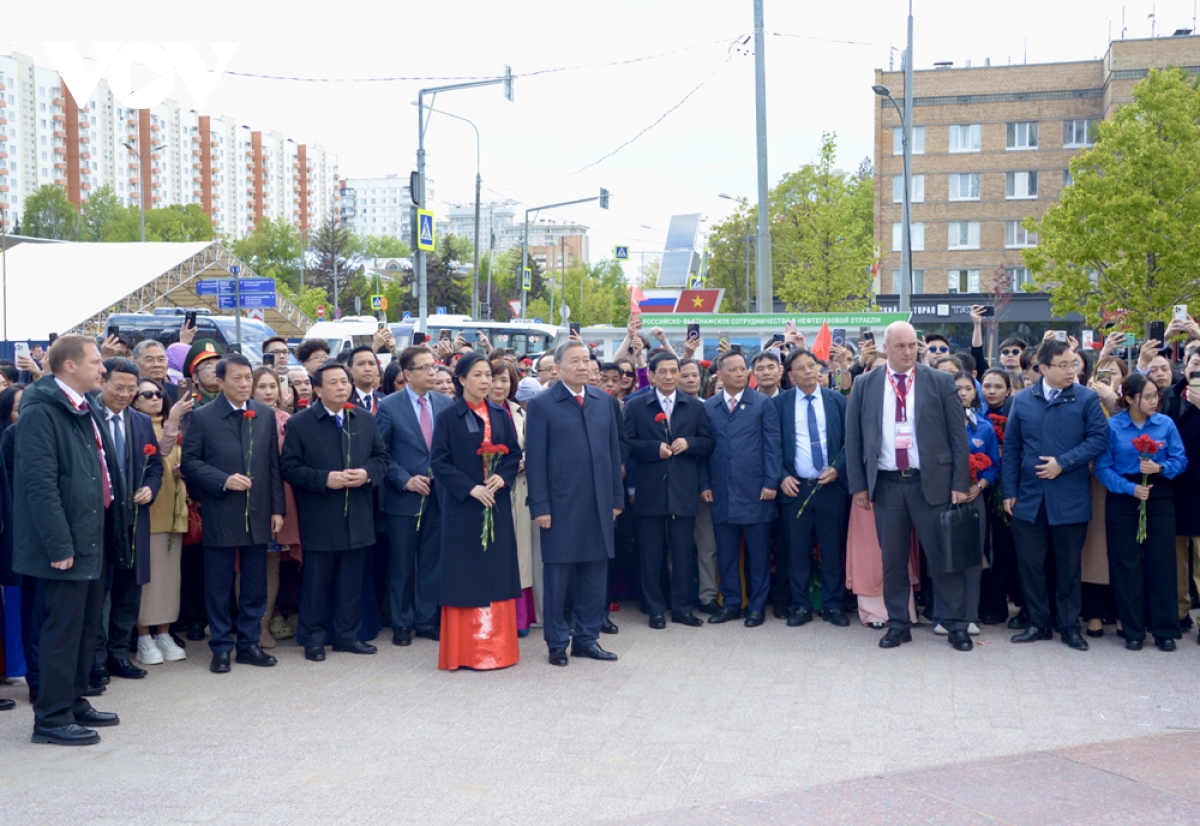 Trong khuôn khổ chuyến thăm chính thức Liên bang Nga và dự Lễ Kỷ niệm 80 năm Ngày Chiến thắng trong chiến tranh Vệ quốc vĩ đại, chiều 10/5 theo giờ địa phương, Tổng Bí thư Tô Lâm và Phu nhân cùng Đoàn đại biểu cấp cao Việt Nam đã đến dâng hoa tưởng nhớ Chủ tịch Hồ Chí Minh tại Tượng đài Hồ Chí Minh ở Quảng trường Hồ Chí Minh và dâng hoa tưởng nhớ Tổng Bí thư Lê Duẩn tại bia lưu niệm ở Quảng trường Lê Duẩn, thủ đô Moscow, Liên bang Nga.
