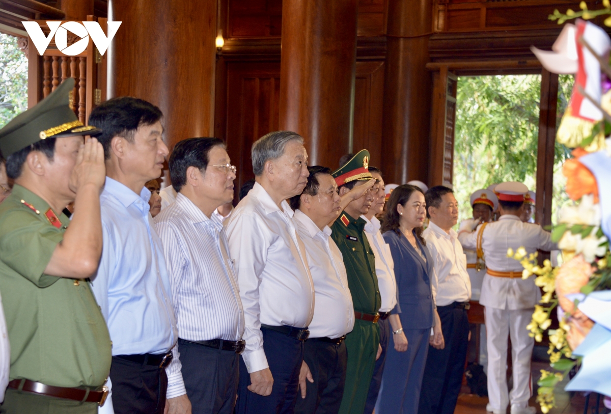 VOV.VN - Ngày 11/10, trong chuyến công tác tại Nghệ An, Tổng Bí thư Tô Lâm và Đoàn công tác của Trung ương đã đến dâng hoa, dâng hương tại Đền Chung Sơn - Đền thờ Gia tiên Bác Hồ và tại Khu Di tích Quốc gia Đặc biệt Kim Liên, tỉnh Nghệ An.