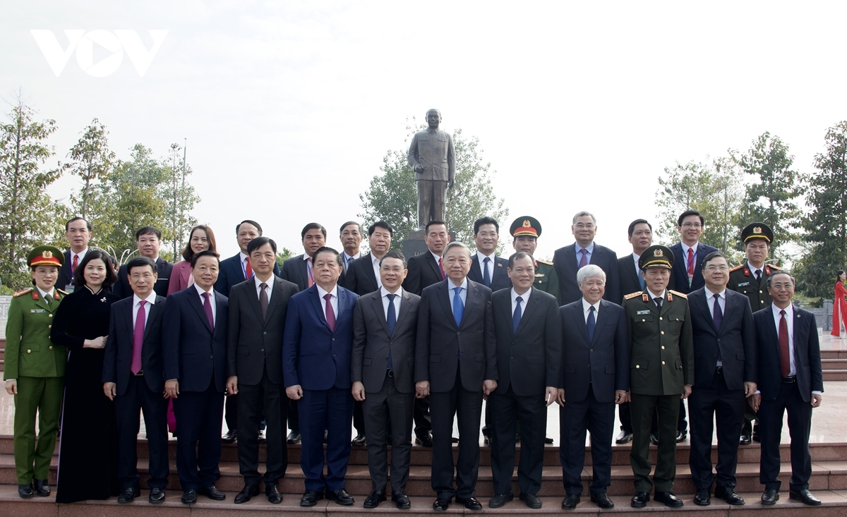 Tổng Bí thư Tô Lâm và đoàn công tác chụp ảnh lưu niệm tại Tượng đài Tổng Bí thư Trường Chinh.