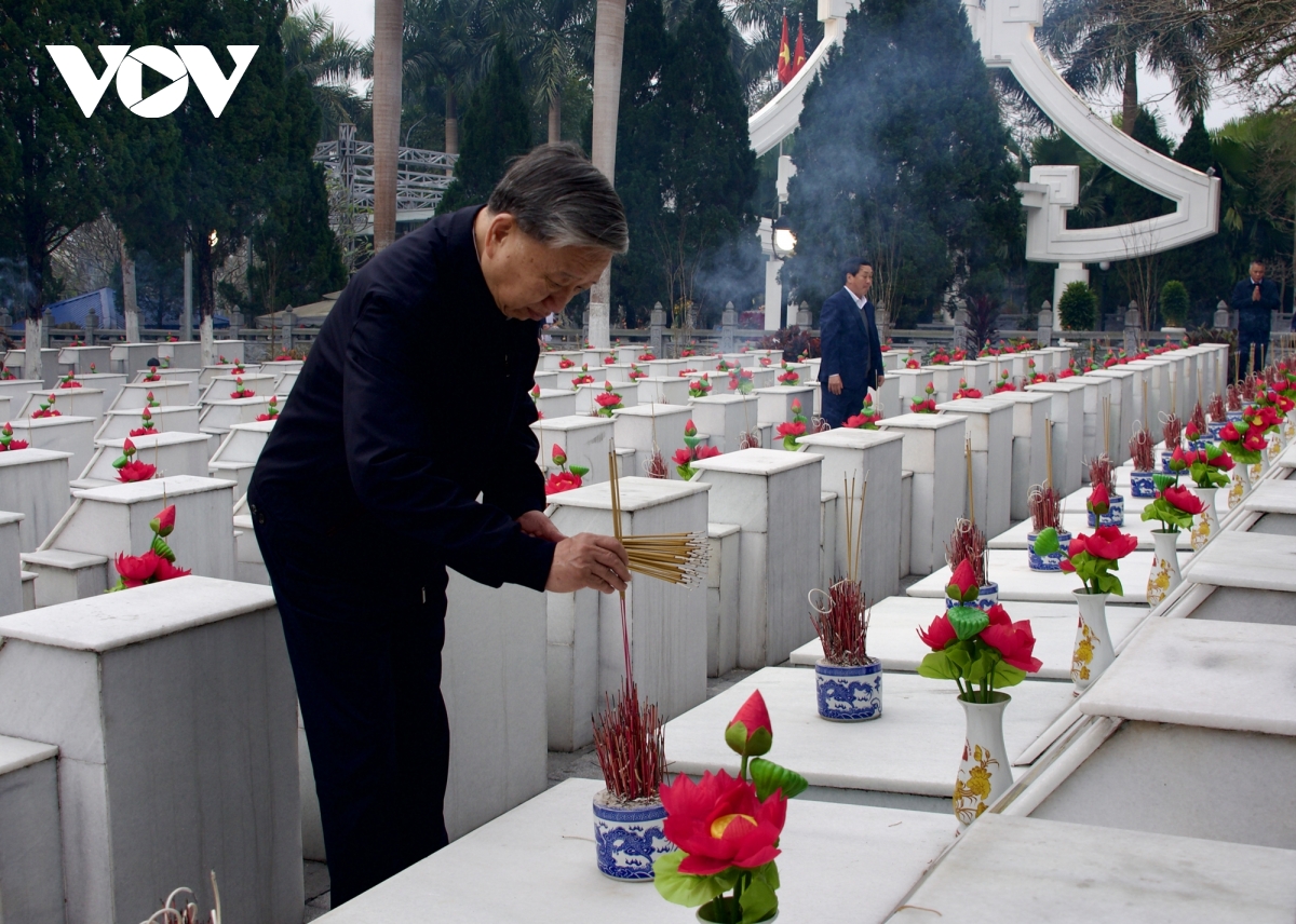 VOV.VN - Ngày 5/2, Tổng Bí thư Tô Lâm cùng đoàn công tác TƯ thành kính dâng hoa, dâng hương, dâng lễ tưởng nhớ và tri ân các anh hùng liệt sĩ tại nghĩa trang liệt sĩ Quốc gia Vị Xuyên, Hà Giang.