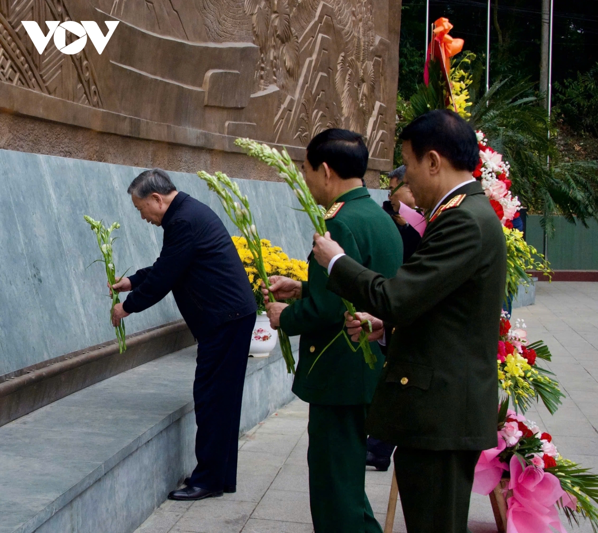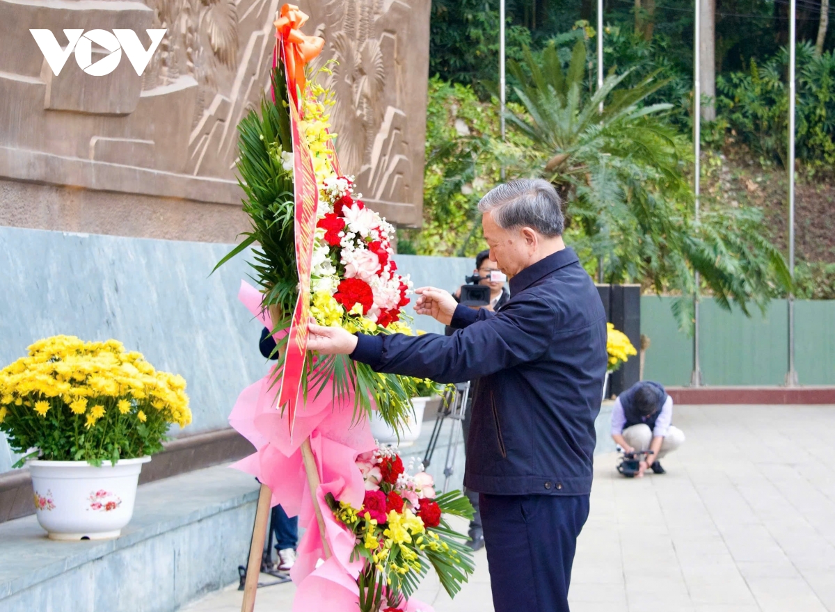Tiếp đó, Tổng Bí thư Tô Lâm cùng Đoàn công tác đã đến dâng hoa tưởng nhớ Chủ tịch Hồ Chí Minh tại Bức phù điêu Bác Hồ nói chuyện với cán bộ, chiến sĩ Đại đoàn quân Tiên Phong tại Ngã năm Đền Giếng, dưới chân núi Nghĩa Lĩnh.