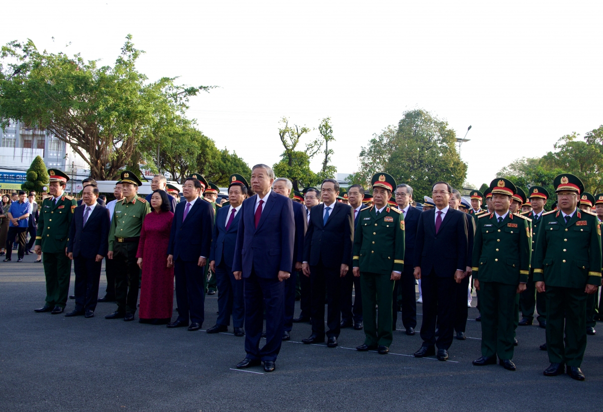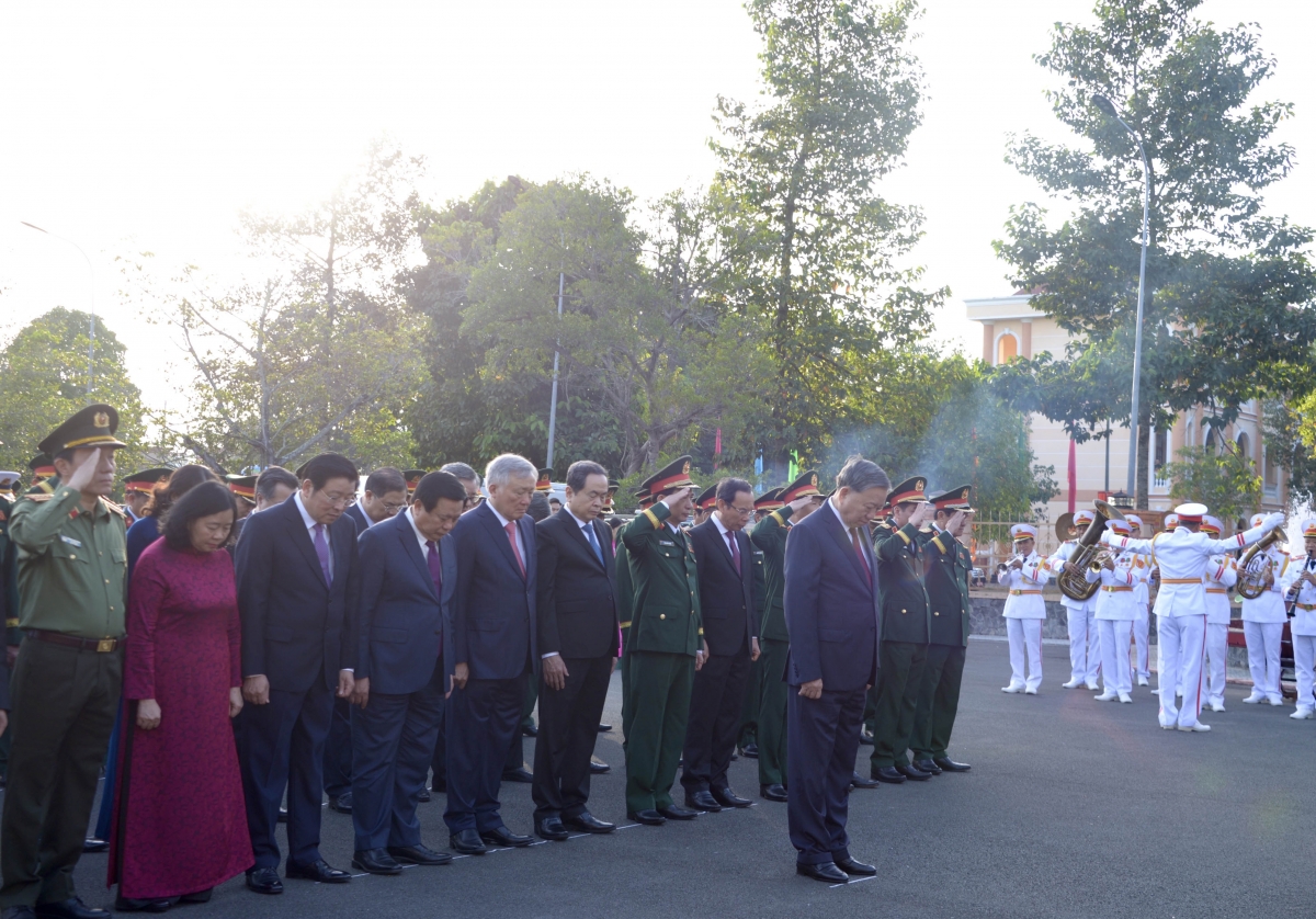 Đầu giờ sáng nay (8/12), trước khi tham dự lễ kỷ niệm, Tổng Bí thư Tô Lâm cùng đoàn công tác đã tới dâng hoa, dâng hương tại Nhà bia tưởng niệm các Anh hùng liệt sĩ; Tượng đài Chiến thắng và Nhà tưởng niệm Chủ tịch Hồ Chí Minh trong khuôn viên Quân khu 9.