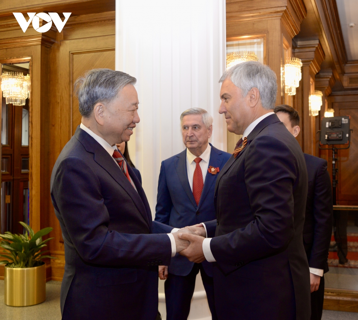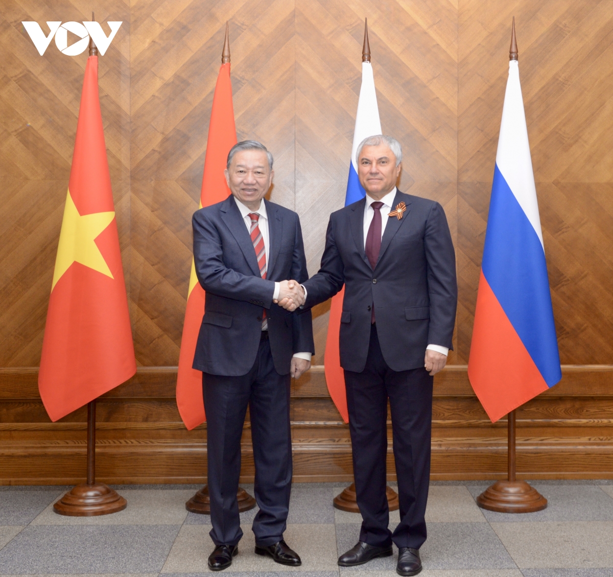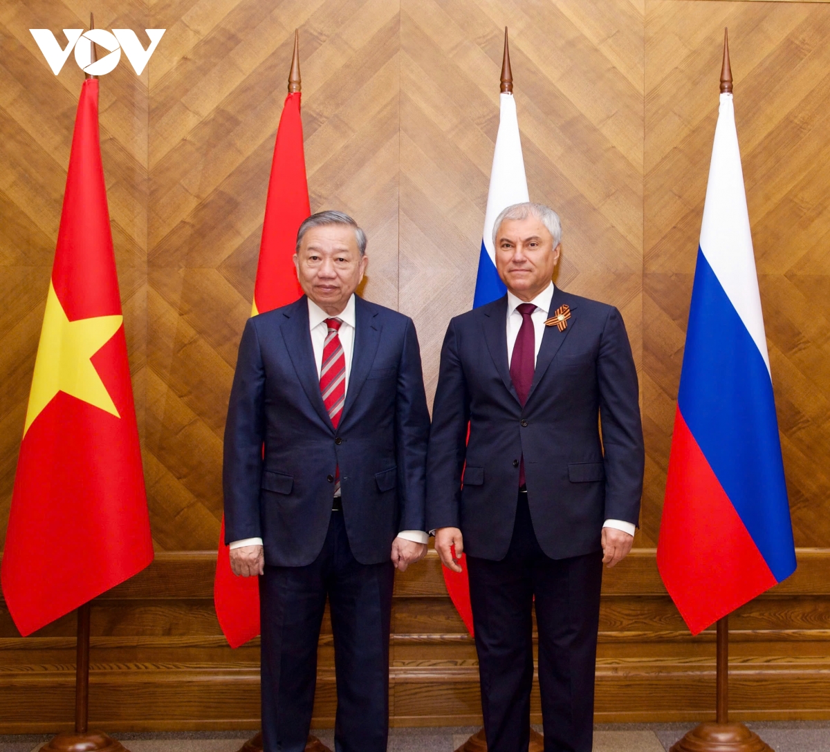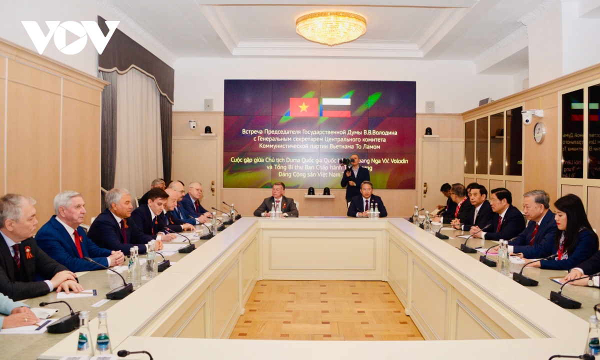 Chủ tịch Duma Quốc gia Vyacheslav Volodin bày tỏ vui mừng gặp lại Tổng Bí thư Tô Lâm và cảm ơn Tổng Bí thư Tô Lâm đã thay mặt Đảng, Nhà nước Việt Nam dẫn đầu đoàn đại biểu cấp cao Việt Nam dự Lễ Kỷ niệm 80 năm Chiến thắng trong Chiến tranh Vệ quốc vĩ đại, thể hiện tình đồng chí anh em và tình cảm của Việt Nam dành cho Liên Xô trước đây và nước Nga ngày nay.