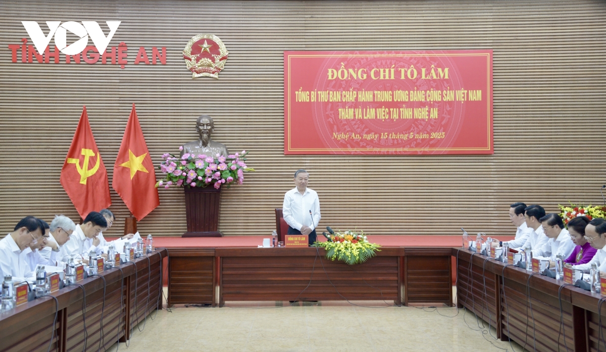 VOV.VN - Sáng ngày 15/5, Tổng Bí thư Tô Lâm cùng đoàn công tác có cuộc làm việc với Ban thường vụ tỉnh uỷ Nghệ An.