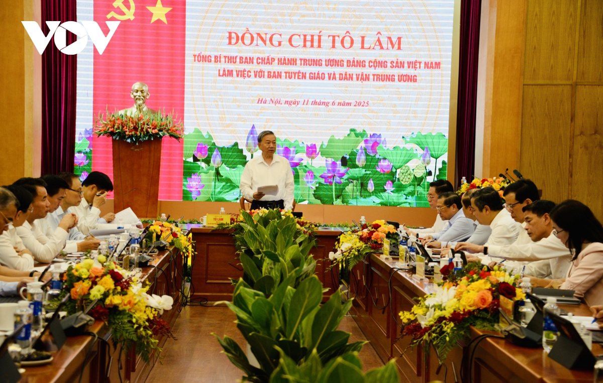 VOV.VN - Chiều 11/6 tại Hà Nội, Tổng Bí thư Tô Lâm tới thăm và chủ trì buổi làm việc với Ban Tuyên giáo và Dân vận Trung ương về tình hình thực hiện nhiệm vụ sau hợp nhất đến nay.