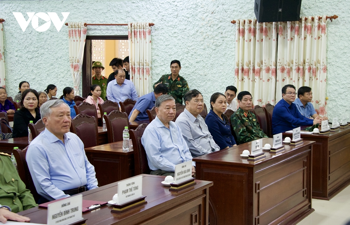 Tại xã Quảng Điền (thành phố Huế), Tổng Bí thư Tô Lâm đã đến thăm hỏi, động viên các gia đình thôn Khuông Phò Đông - thôn bị cô lập bởi mưa lũ trong những ngày qua. Tại đây, Tổng Bí thư đã thăm hỏi ân cần và chia sẻ sâu sắc trước những thiệt hại, mất mát do mưa lũ gây ra và mong người dân vượt qua khó khăn, sớm ổn định cuộc sống.