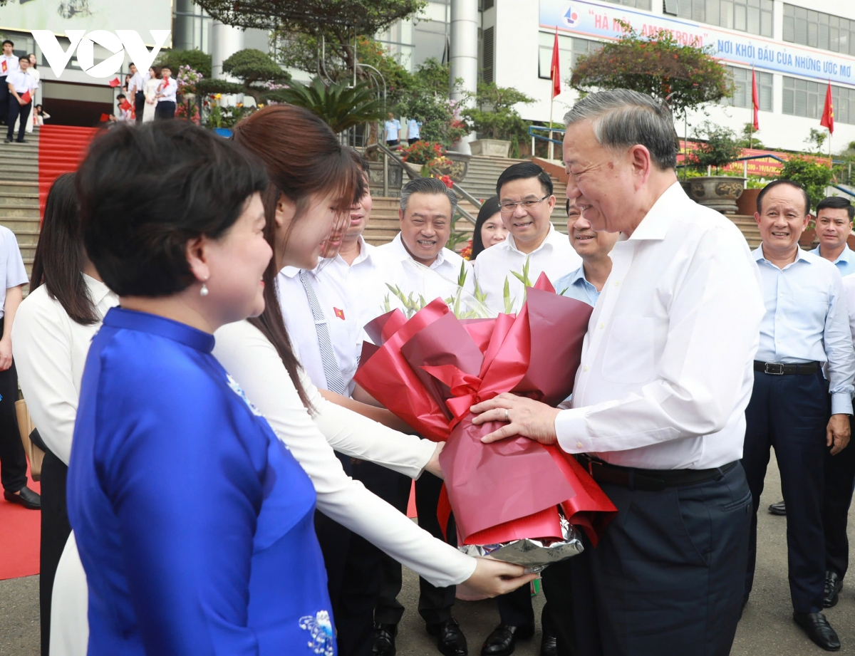 Thầy trò trường THPT chuyên Hà Nội - Amsterdam tặng hoa cho Tổng Bí thư Tô Lâm
