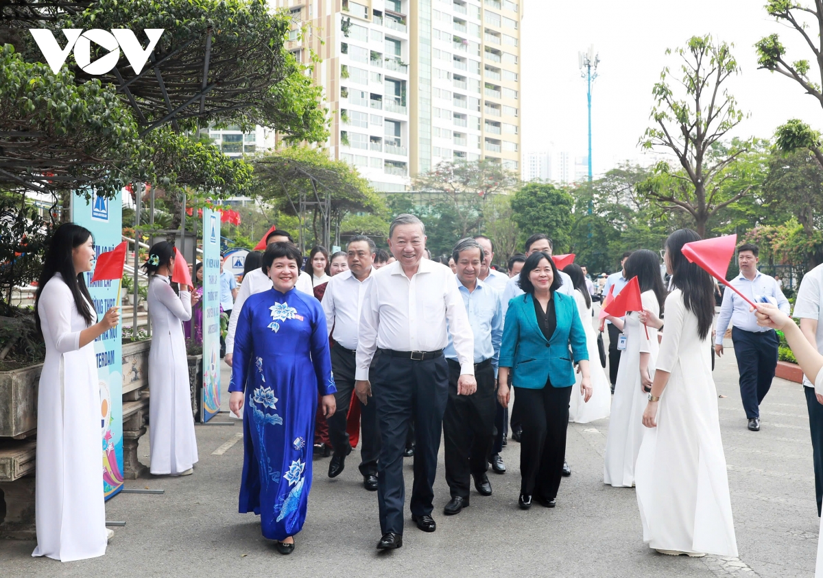 Dịp này, Tổng Bí thư Tô Lâm cũng đề nghị các cấp ủy Đảng, chính quyền, ngành Giáo dục Thủ đô, các tổ chức đoàn thể và toàn xã hội tiếp tục hiện đại hóa, nâng cao chất lượng giáo dục và đào tạo, rút ngắn khoảng cách chênh lệch giữa các trường "điểm", trường ở vùng trung tâm với các trường ở các khu vực xa trung tâm; đặc biệt lưu ý phải giảm áp lực với học sinh, tăng cường dạy học về văn hóa, nghệ thuật đảm bảo cho học sinh phát triển toàn diện, nghiên cứu có chính sách hỗ trợ bữa ăn trưa cho học sinh tiểu học và trung học cơ sở.