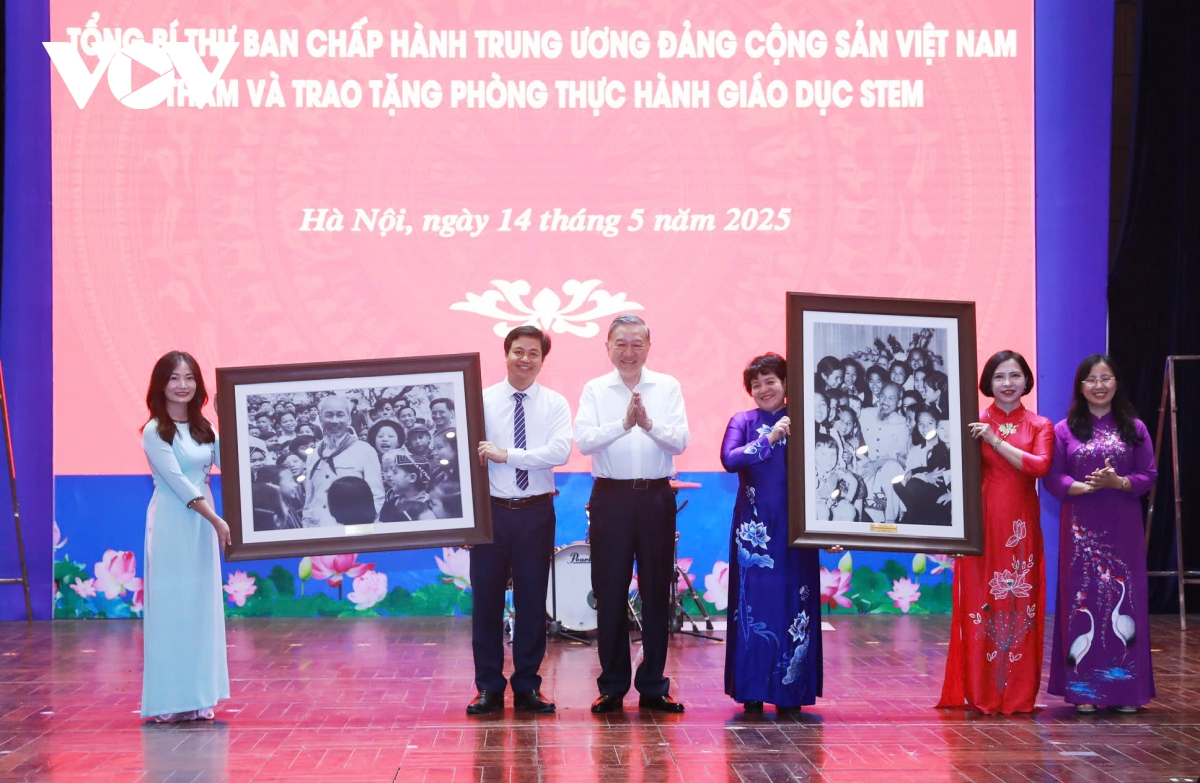 VOV.VN - Chiều nay (14/5), tại Hà Nội, Tổng Bí thư Tô Lâm đến thăm và trao tặng phòng thực hành giáo dục Stem tặng trường THPT chuyên Hà Nội - Amsterdam và trường Trung học cơ sở Cầu Giấy. Đây là 2 cơ sở giáo dục đào tạo chất lượng cao hàng đầu của thành phố Hà Nội.