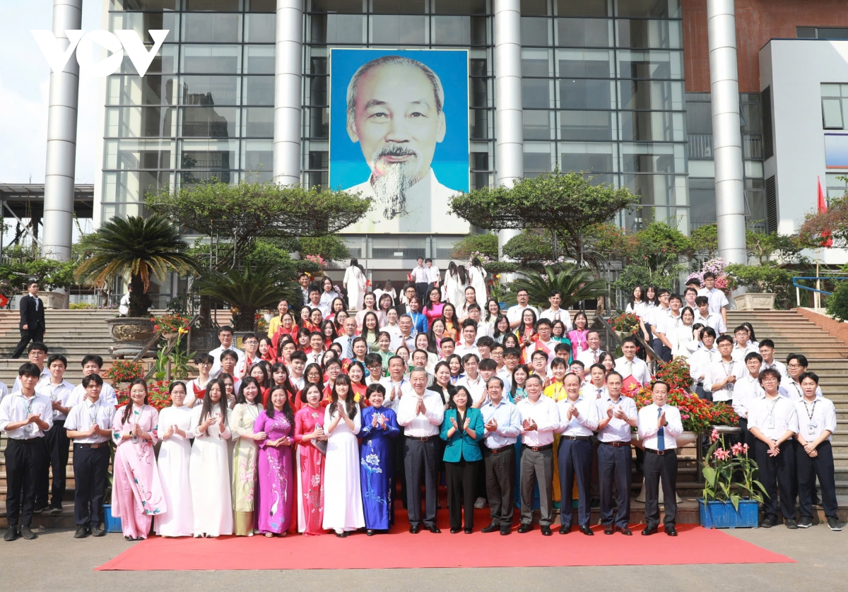 Tổng Bí thư Tô Lâm cùng các thầy cô và học sinh chụp ảnh chung