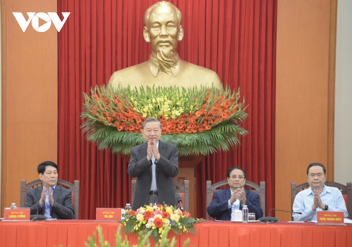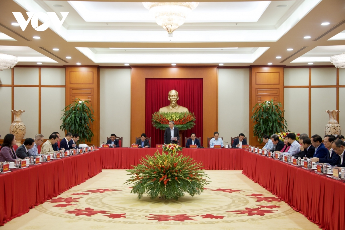 Tổng Bí thư cũng lưu ý Tổ biên tập cần kịp thời bổ sung, cập nhật những tư tưởng, tinh thần và quyết sách rất mới của Trung ương như việc sắp xếp, tinh gọn tổ chức bộ máy của hệ thống chính trị, sáp nhập tỉnh, bỏ trung gian cấp huyện, thực hiện Nghị quyết về đột phá hoa học công nghệ, đổi mới sáng tạo và chuyển đổi số quốc gia vào Dự thảo báo cáo chính trị.