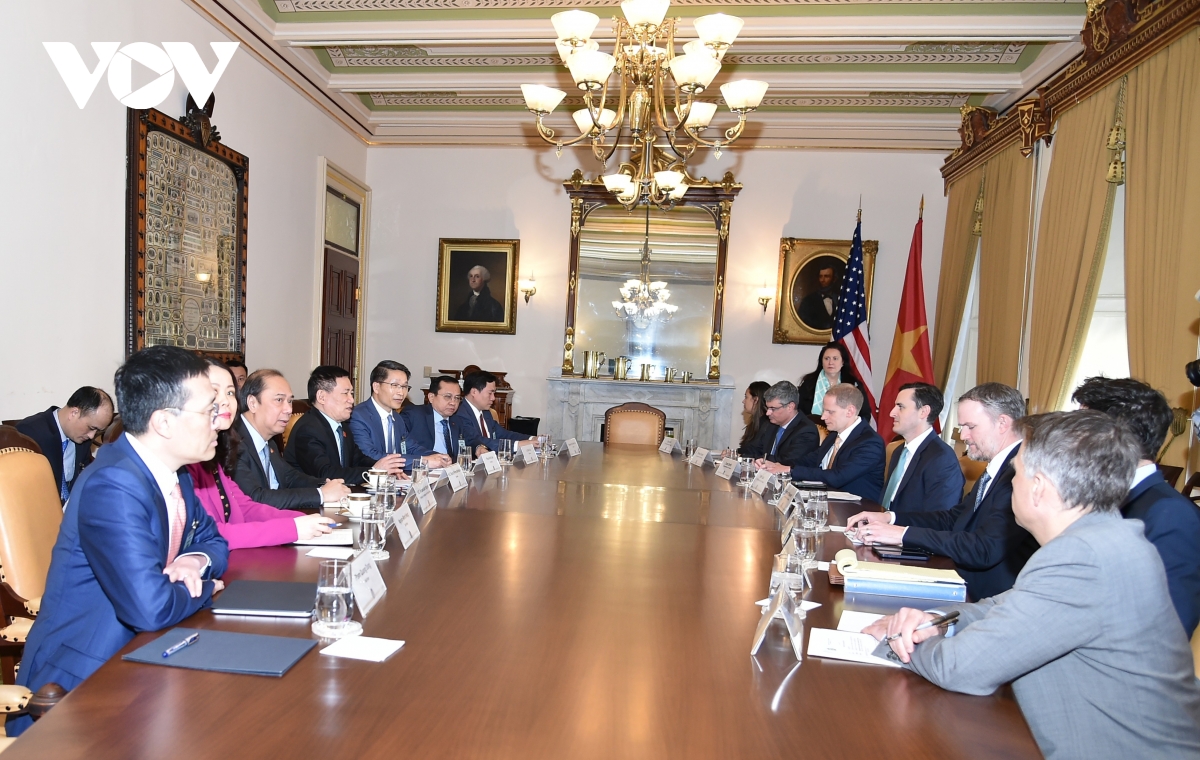 VOV.VN - Chiều 9/4 (giờ địa phương), trong khuôn khổ chuyến thăm Hoa Kỳ với tư cách là Đặc phái viên của Tổng Bí thư Tô Lâm để trao đổi về các vấn đề kinh tế - thương mại song phương, Phó Thủ tướng Chính phủ Hồ Đức Phớc đã gặp Đại diện Thương mại Hoa Kỳ Jamieson Greer.