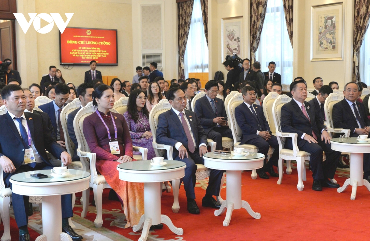 Thay mặt lãnh đạo Đảng và Nhà nước, Chủ tịch nước Lương Cường đã gửi tới toàn thể cộng đồng người Việt Nam đang sinh sống, học tập và làm việc tại Trung Quốc, các cán bộ, nhân viên Đại sứ quán Việt Nam những tình cảm chân thành và những lời chúc tốt đẹp nhất. Chủ tịch nước đã thông báo một số kết quả trong các cuộc làm việc với các đồng chí lãnh đạo của Trung Quốc, nhất là cuộc hội đàm với Tổng Bí thư, Chủ tịch Trung Quốc Tập Cận Bình nhằm củng cố, tăng cường tin cậy chính trị giữa hai bên; các biện pháp mở rộng và nâng cao hiệu quả hợp tác trên các lĩnh vực, thúc đẩy tháo gỡ vướng mắc trong hợp tác; phát huy tối đa điểm tương đồng, tìm cách kiểm soát bất đồng, vì hòa bình, hợp tác và phát triển.