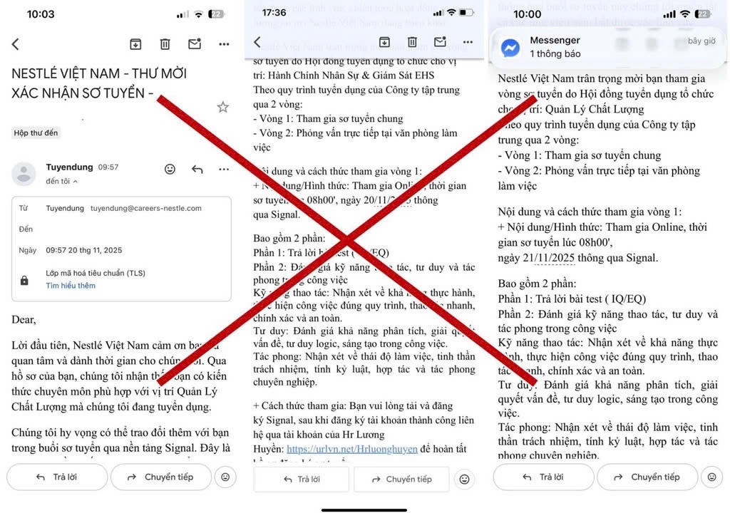 Nestlé Việt Nam vừa phát đi cảnh báo về việc xuất hiện nhiều thông tin tuyển dụng giả mạo, kêu gọi ứng viên làm việc trực tuyến, làm việc online và yêu cầu chuyển tiền hoặc cung cấp dữ liệu cá nhân. Doanh nghiệp khẳng định đây không phải là hình thức tuyển dụng chính thống của Nestlé Việt Nam.